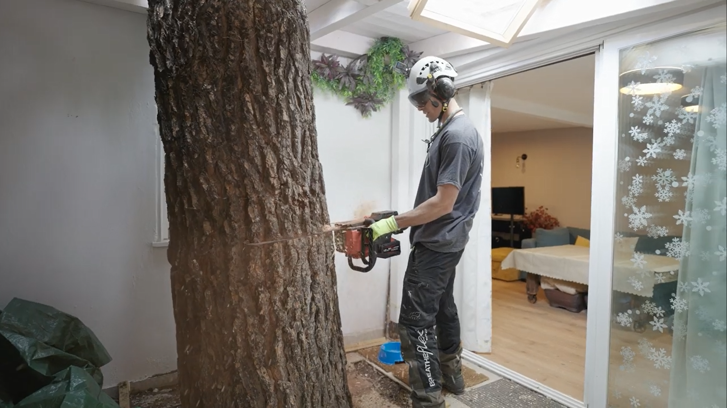 Etter at alt utvendig arbeid var utført, fortsatte teamet inne i huset. Her ble trestammen som hadde vokst gjennom en utvendig bygning kuttet i seksjoner. Arbeidet foregikk i trange rom med kun 2 cm klaring – og krevde ekstrem nøyaktighet for å få stammen ut gjennom taket.